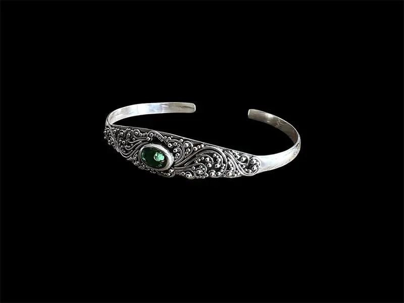 De zilveren dames armband Siti Green is een prachtige toevoeging aan elke sieradencollectie. Deze sierlijke armband is gedetailleerd bewerkt met verfijnde filigrain, wat een vleugje elegantie en klasse toevoegt aan uw pols.