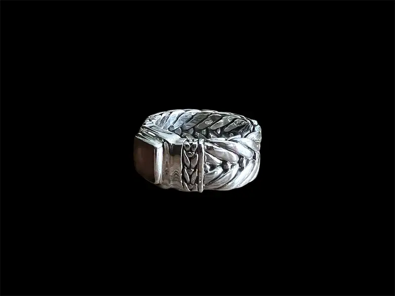 Deze ring is niet alleen een blikvanger door het unieke design, maar de tiger eye steen voegt ook een extra dimensie toe met zijn diepe, bruine tinten. De steen staat bekend om zijn beschermende en aardende eigenschappen, wat de ring niet alleen mooi, maar ook symbolisch waardevol maakt.