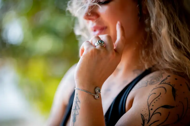 - Steen: De ring bevat een blauwe agaat, een steen die bekend staat om zijn kalmerende en harmoniserende eigenschappen.