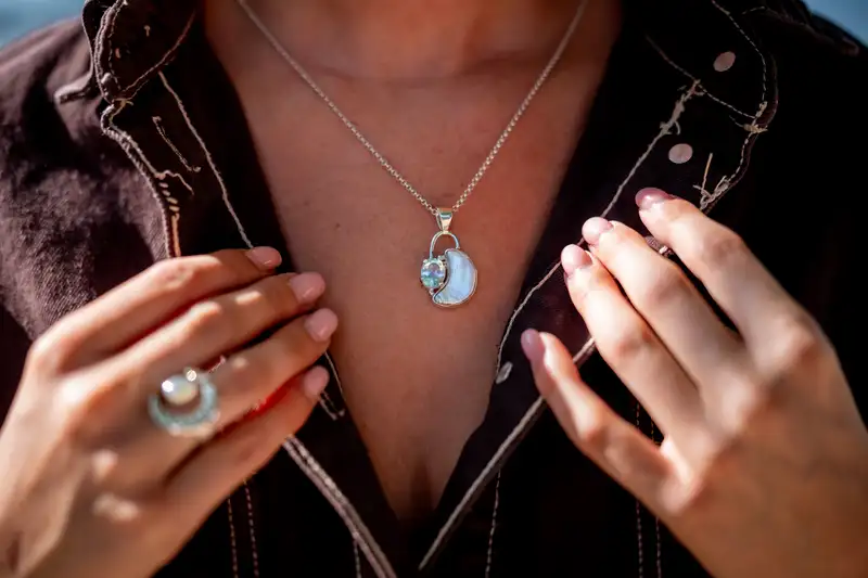 - Edelsteen: Naast het maantje straalt een schitterende blauwe agaat steen, die niet alleen een vleugje kleur toevoegt, maar ook bekend staat om zijn kalmerende en harmoniserende eigenschappen.